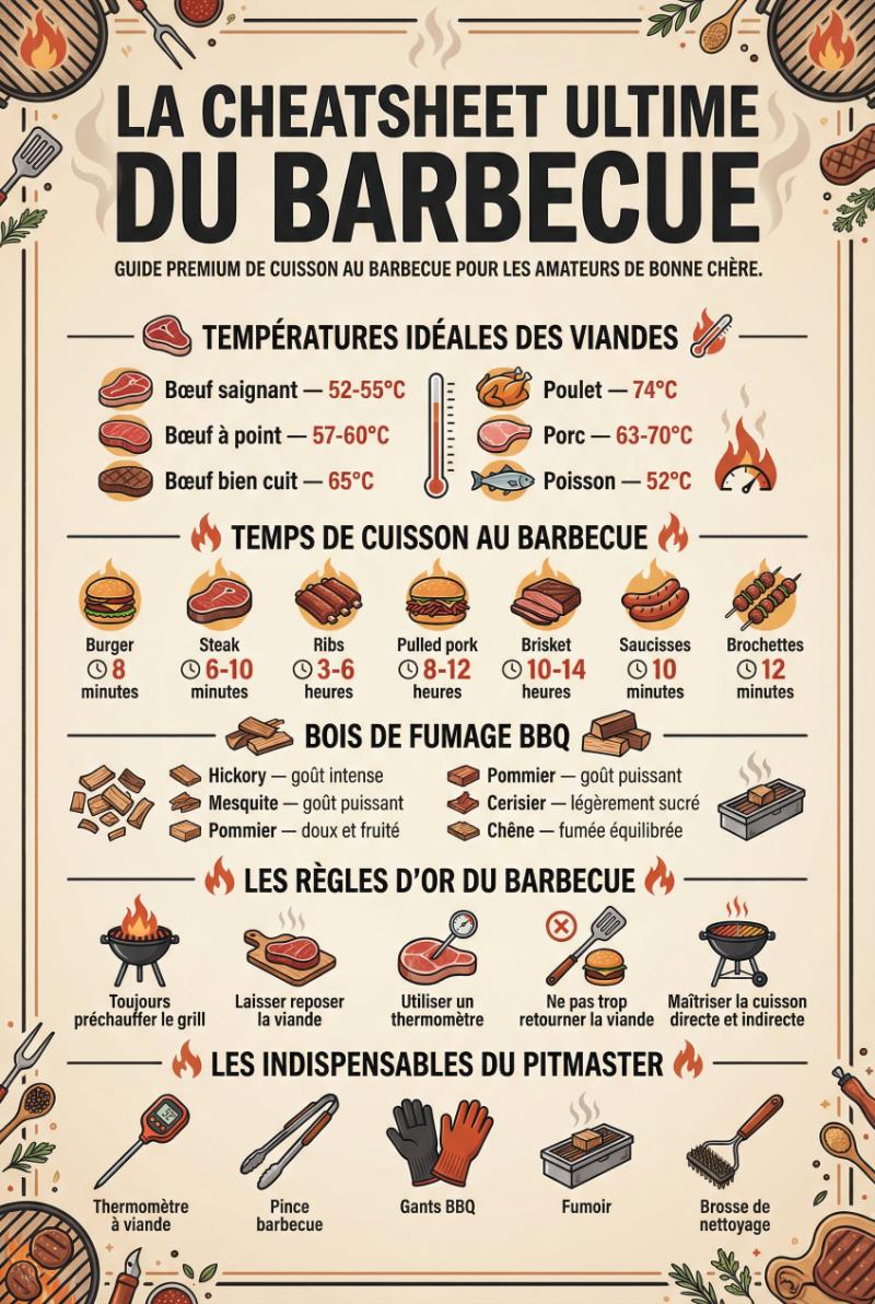 Toutes les températures, temps de cuisson et règles essentielles du barbecue réunis dans une fiche pratique simple à consulter près du grill.